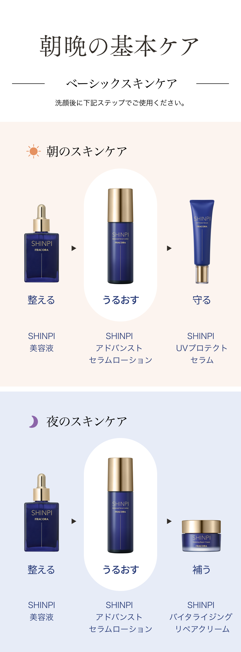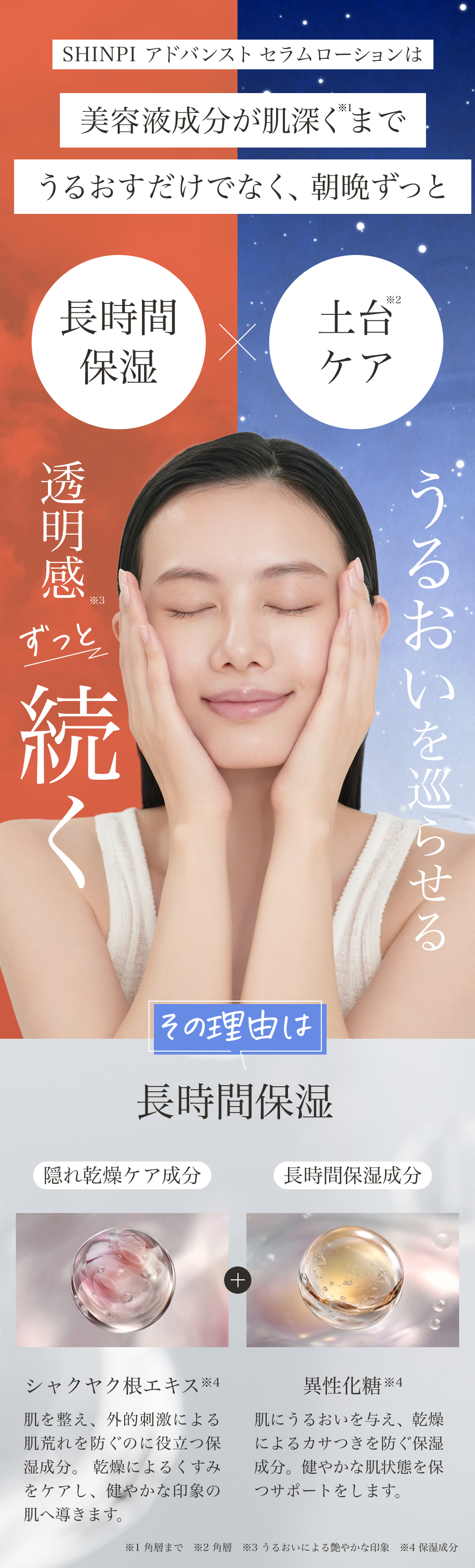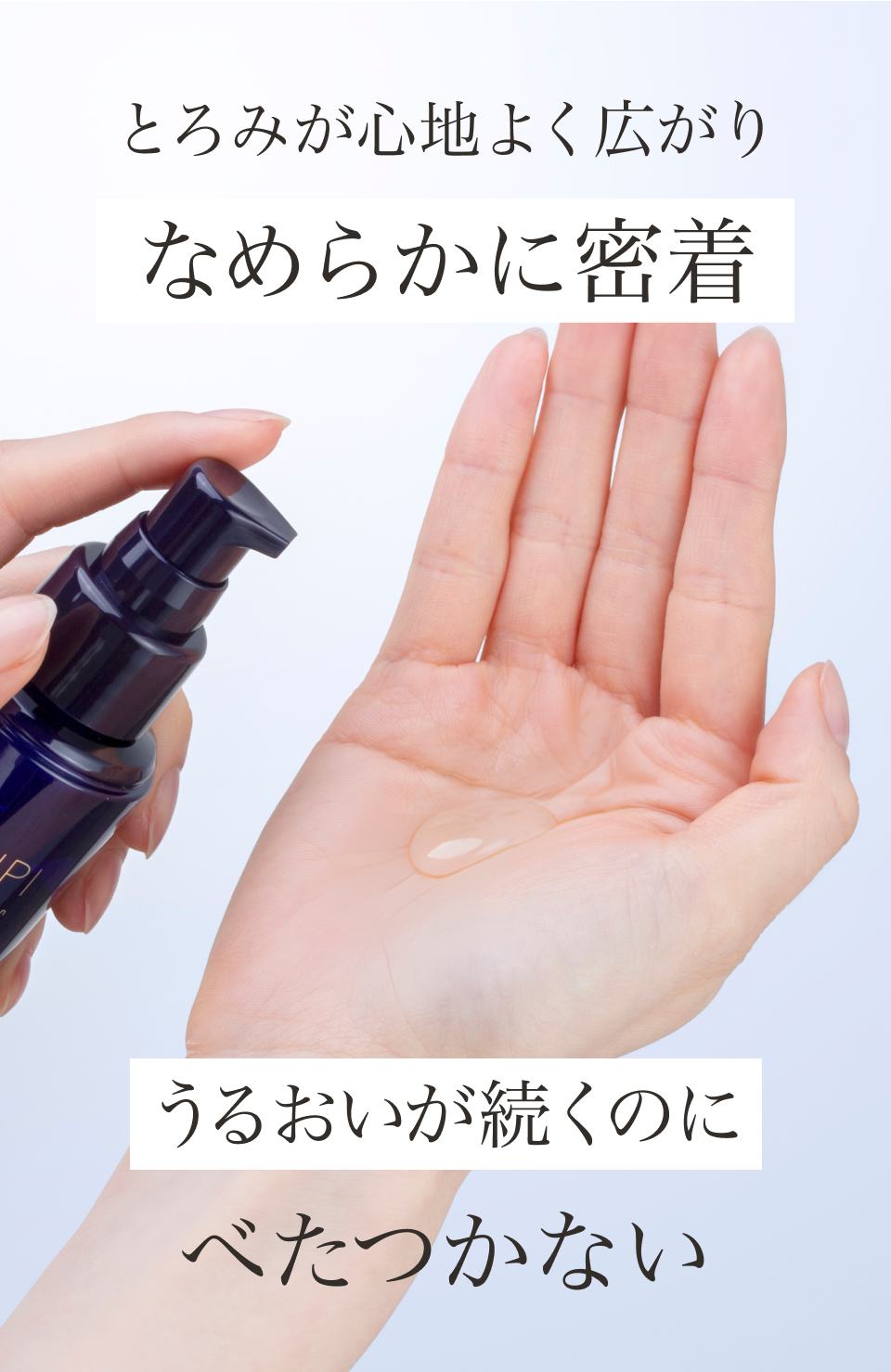 洗顔後、またはSHINPI美容液で肌を整えた後、ディスペンサー2回押し分を手のひらに取り、顔全体になじませてください。